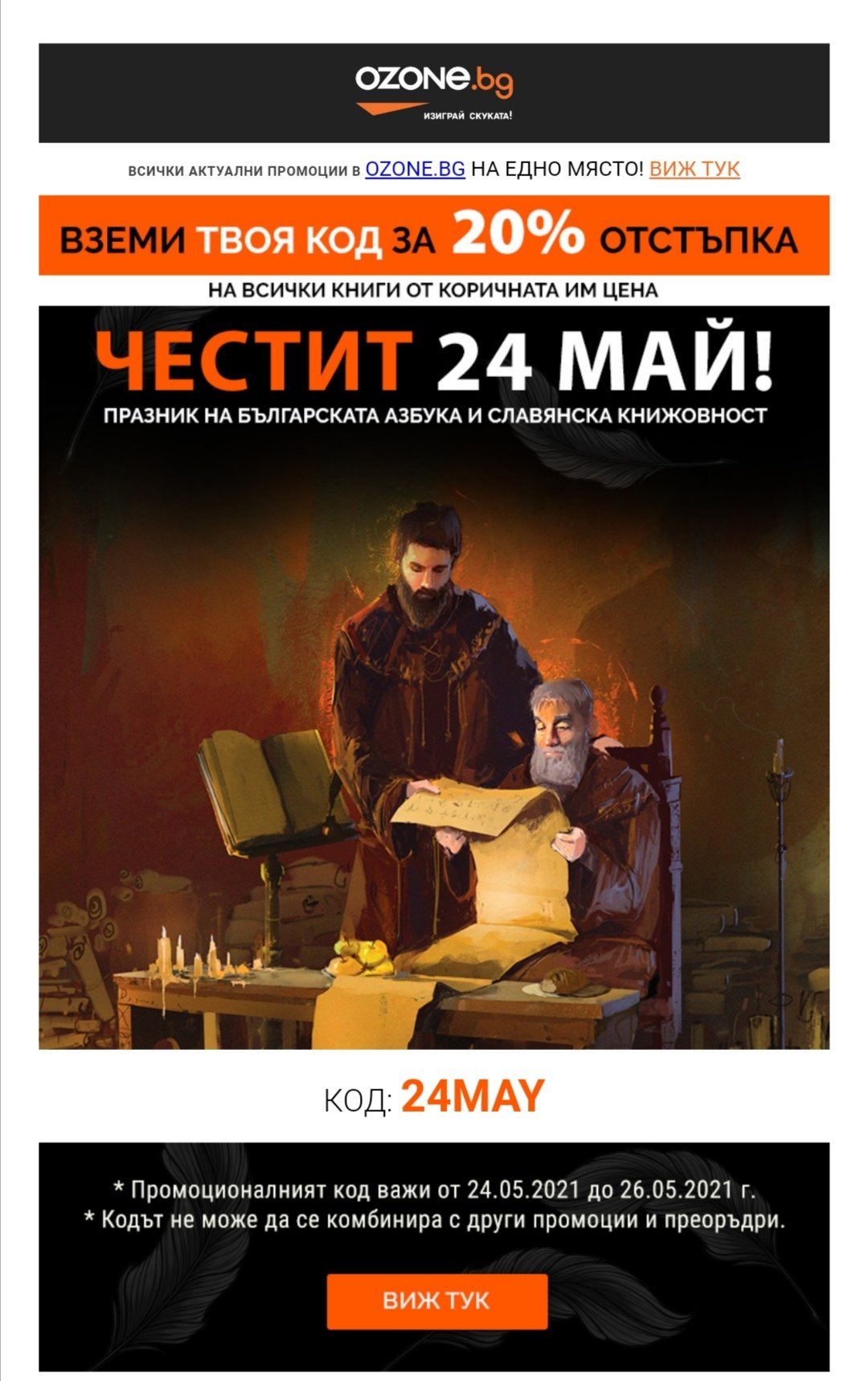 Потребителите имат различни мнения относно отстъпките на книгите в различните онлайн магазини. Някои очакват по-големи намаления по време на Панаира на книгата, като предполагат около 20-30% намаление. Други споменават, че Колибри има отстъпка от 24% до 24 май за определени заглавия. Освен това някои потребители отбелязват, че Ozone е пуснал великденски отстъпки до 80%, като повечето се движат около 25-30%, но има и повече. Въпреки това, има и такива, които изразяват съмнения относно отстъпките, като предполагат, че някои книги са били на по-ниски цени преди.