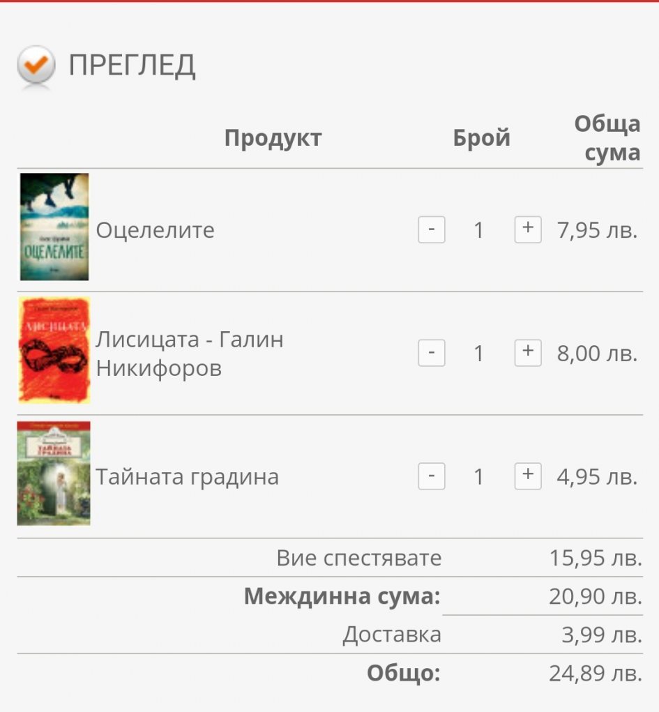 Сиела от миналата година имат доставка по време на промо 50%,но въпреки това си струва. Няма друго издателство с такова намаление. Тази година пропускам. Все още чакам поръчка от Озон на преордер за 74 лв. Моите пари за книги съм си ги изхарчила