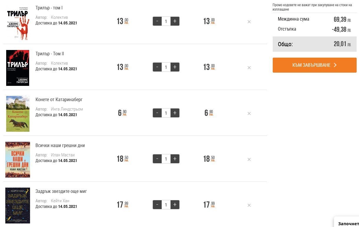 Потребителите имат различни мнения относно отстъпките на книгите в различните онлайн магазини. Някои очакват по-големи намаления по време на Панаира на книгата, като предполагат около 20-30% намаление. Други споменават, че Колибри има отстъпка от 24% до 24 май за определени заглавия. Освен това някои потребители отбелязват, че Ozone е пуснал великденски отстъпки до 80%, като повечето се движат около 25-30%, но има и повече. Въпреки това, има и такива, които изразяват съмнения относно отстъпките, като предполагат, че някои книги са били на по-ниски цени преди.