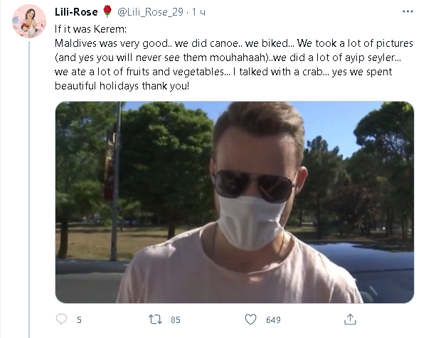 "Малдивите бяха много добри .. направихме кану .. карахме велосипед ... Направихме много снимки (и да, никога няма да ги видите mouhahaah) .. направихме много айпи сейлер ... ядохме много плодове и зеленчуци ... Говорих с рак ... да, прекарахме красиви празници благодаря!"