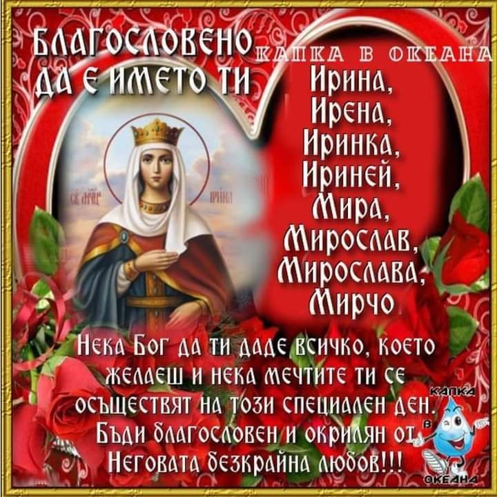 Именици: Борис, Ирина и Михаил, още Богорис, Борил, Бориса, Борислав, Борислава, Борка, Борко, Боряна, Ира, Ирен, Ирена, Иреней, Ириней, Иринка, Мира, Мирена, Миро, Миролюб, Миролюба, Мирон, Мирослав, Мирослава, Мирчо, Мирян, Миряна.