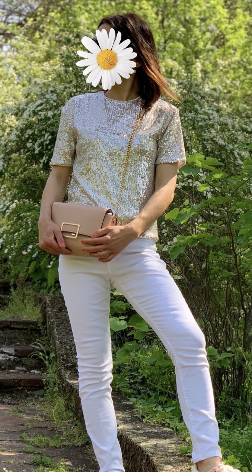 Днес сефтосах пайетената блуза и дънките от детските, блузката е разкош и не боде, обаче дънките седят някак накъдрени и не съм очарована.