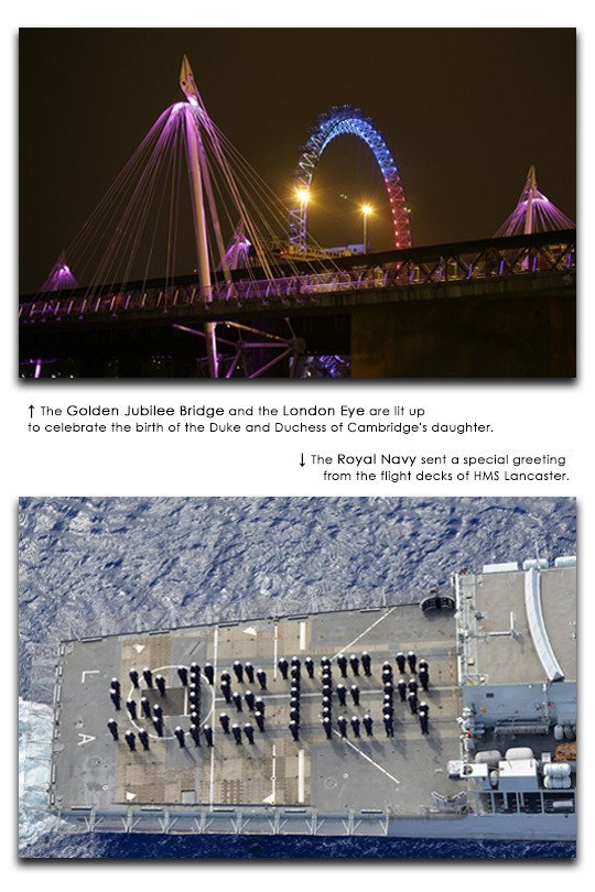 Кралските военноморски сили изпращат поздрав по случай раждането на принцесата. Сформират думата "сестра" на един от корабите си.