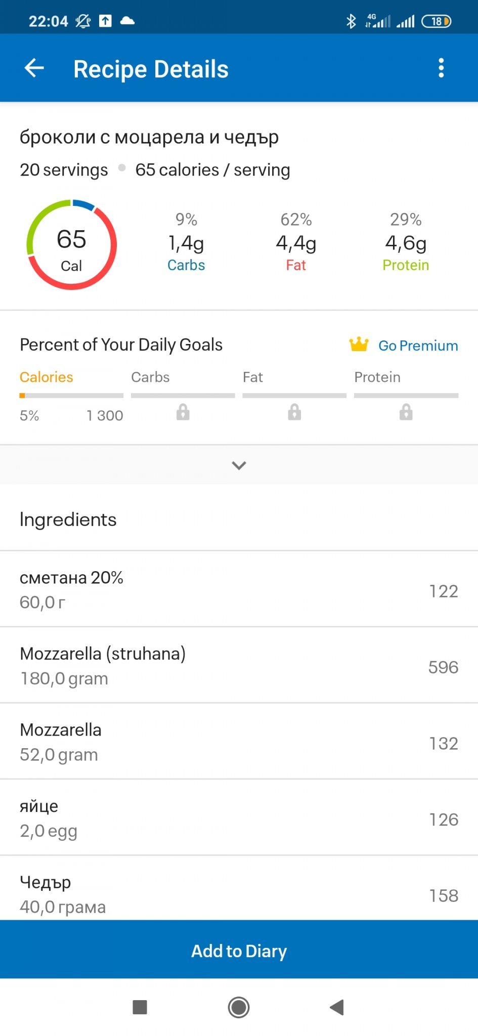 Вчера правих печенки от броколи с моцарела и чедър. Прилагам снимка. Иначе, да сигурно ще даде резултат, но на 1200 калории без толкова мазнини, а с повече въглехидрати не съм се чувствала така сита и без нужда от сладко, десерт и похапване. Сега съм ок. Тази вечер например си направих салата с домати, краставици, маслини, авокадо и сусам. Всичко това са хубави мазнини, но в съчетание с нещо въглехидратно не ми се отразяваха позитивно на теглото.
