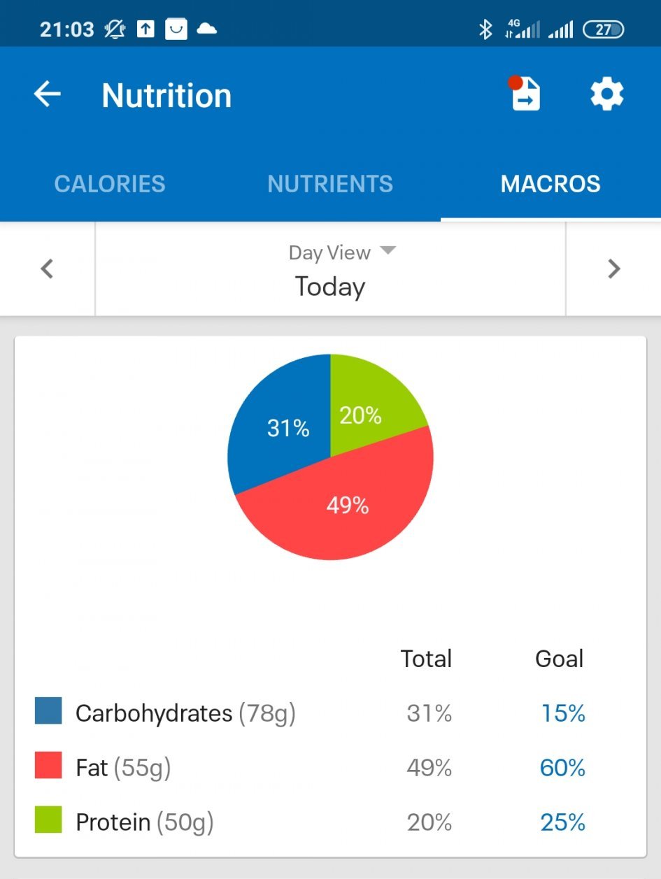 Благодаря ти, Дез. Днес е трети ден. Успявам да държа въглехидратите на 60-90 грама което за мен е наистина огромен успех, обаче мазнините са ми не повече от 50-60 грама. На теория искам да го вдигна, но на практика ми е малко мазнио и тежко и не знам дали искам да ги кача още. Иначе разпределението изглежда така днес на около 1200 калории