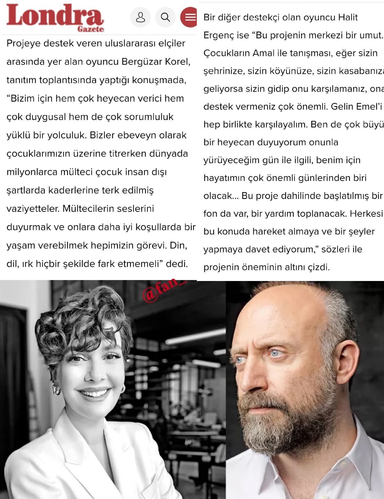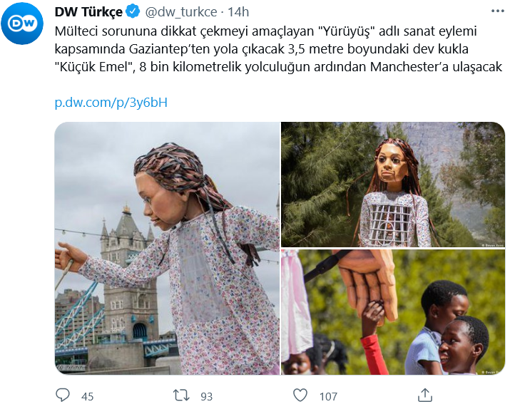 Пара Бергюзар Корель и Халит Эргенч вместе с всемирно известными именами поддержат путешествие Амаль. Проект “The Walk-Yürüyüş”, описывающий путешествие марионетки высотой 3,5 метра от турецко-сирийской границы до Великобритании, символизирующей 9-летнюю сирийскую девочку-беженку по имени Амаль, начинает делать первые шаги, которые он предпримет сегодня в замке Газиантеп.