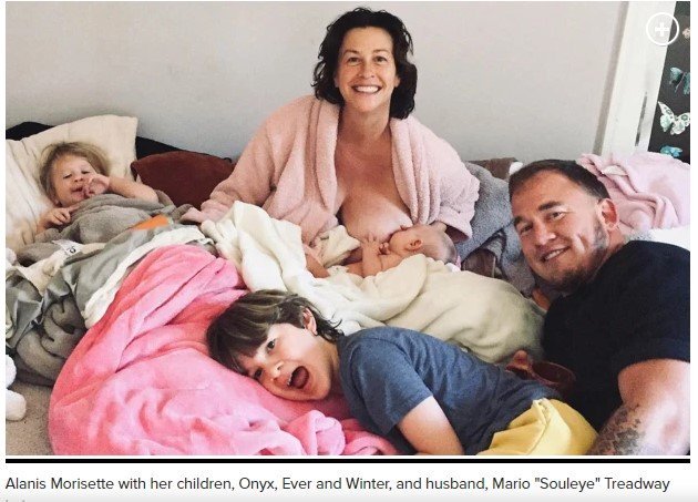 А тук пак двамата с трите деца, Аланис кърми Simple Smile