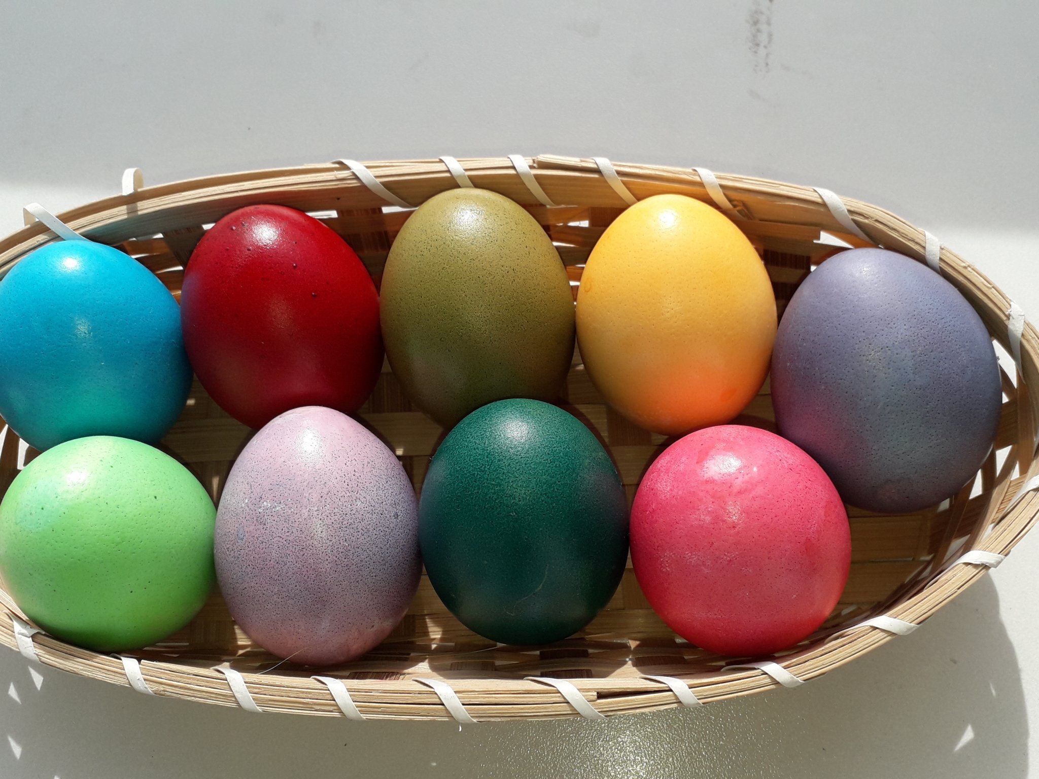 Червеното, масленозеленото и петроленото са на тъмни яйца, другите - на бели. Само жълтото беше слабичко, та му добавих и малко оранжево, че бледнееше.