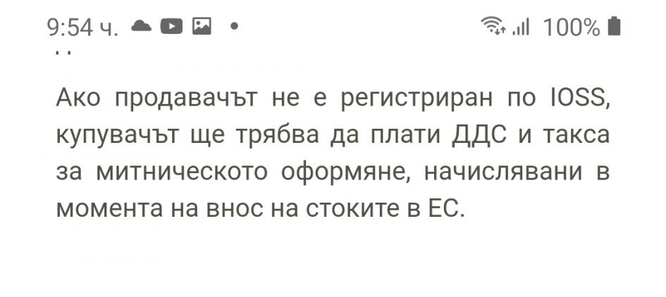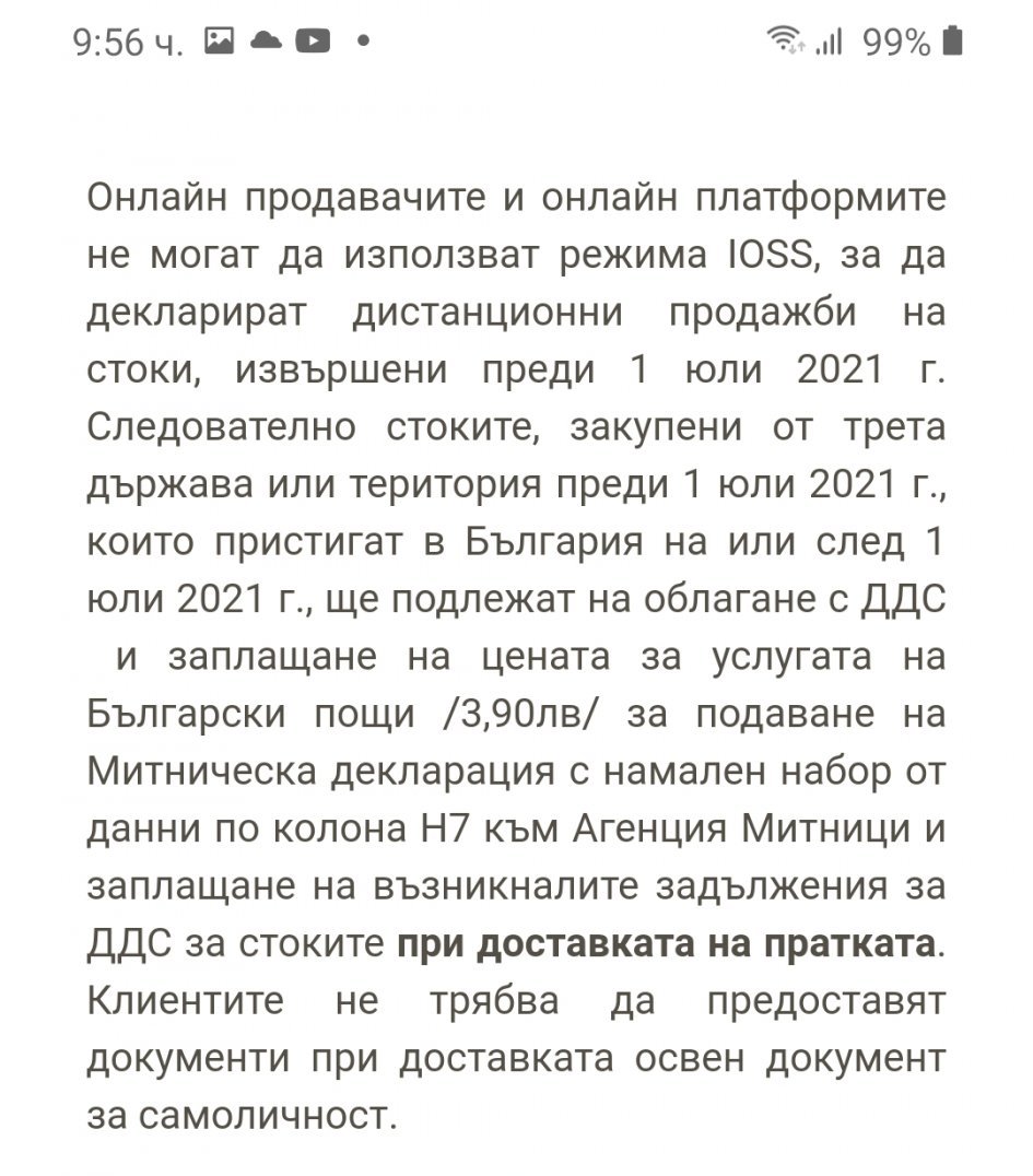След 1 юли 2021 г. всички пратки, независимо кога са поръчани, ще подлежат на начисляване на ДДС. За поръчки, направени преди тази дата, данъкът върху добавената стойност ще бъде изискван и трябва да бъде заплатен при получаване на пратката. След 1 юли 2021 г., ако поръчатe от търговец, регистриран в системата за обслужване на едно лице при вноса (IOSS), ДДС ще бъде включен в цената на стоката и няма да има допълнителни митнически такси за вноса. В такива случаи клиентите няма да дължат нищо при получаване на пратката.