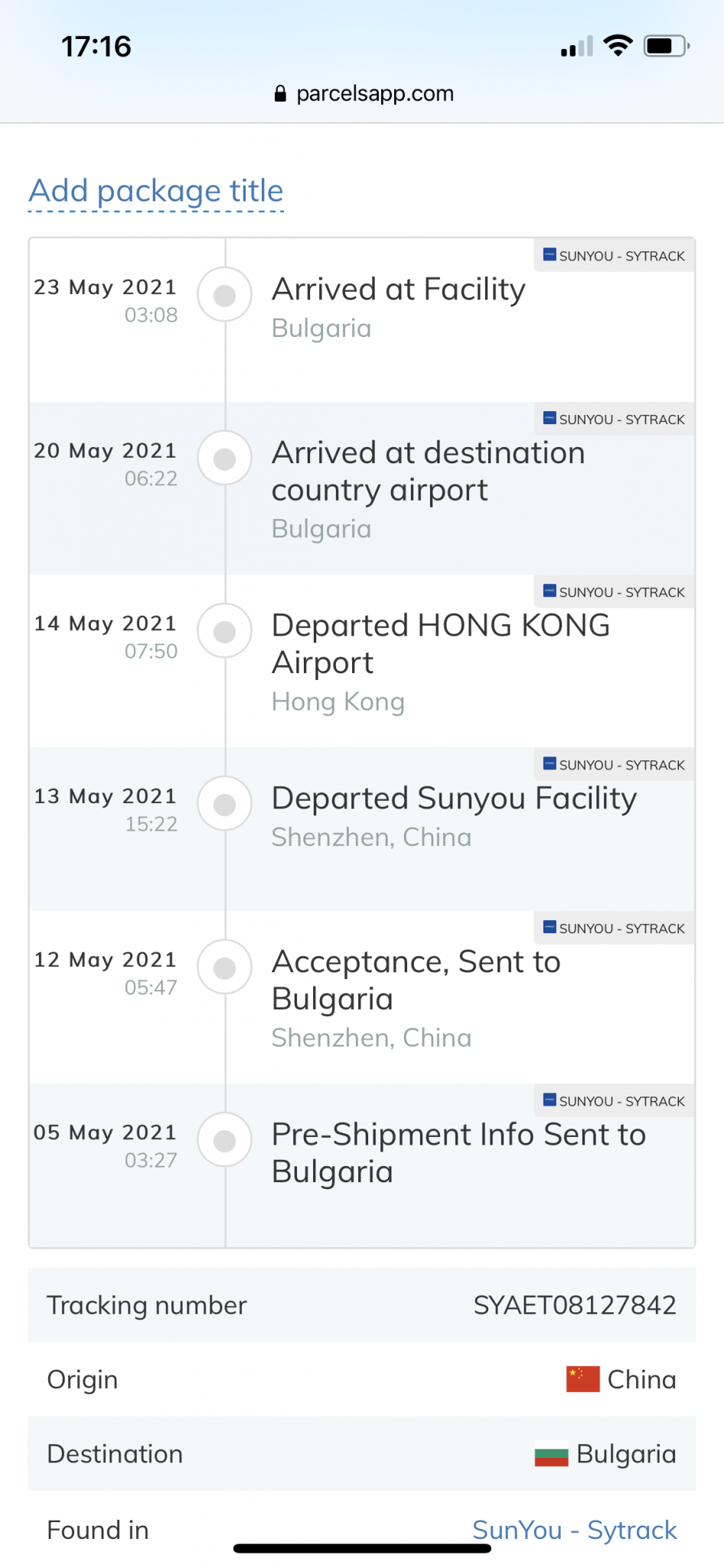 Чакам една пратка вече от 02.05, дали не е време да предприема нещо? В пощата казват, че не е пристигнала още, днес ходих. Ето как изглежда статутът ѝ според тракинга
