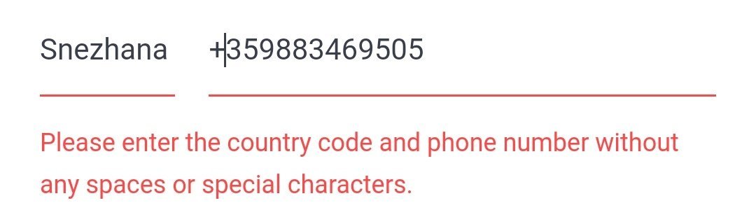 То не трябва ли в първото поле да е кода на страната (country code) а след това в второто поле номера (phone number)? В повечето сайтове където ми изкарва това е по този начин. Никъде не пише да се напише име, не знам защо вие сте го направили.