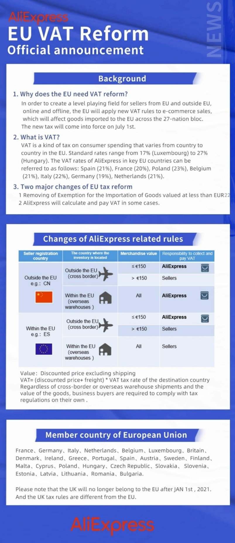 След 1 юли 2021 г. всички пратки, независимо кога са поръчани, ще подлежат на начисляване на ДДС. За поръчки, направени преди тази дата, данъкът върху добавената стойност ще бъде изискван и трябва да бъде заплатен при получаване на пратката. След 1 юли 2021 г., ако поръчатe от търговец, регистриран в системата за обслужване на едно лице при вноса (IOSS), ДДС ще бъде включен в цената на стоката и няма да има допълнителни митнически такси за вноса. В такива случаи клиентите няма да дължат нищо при получаване на пратката.