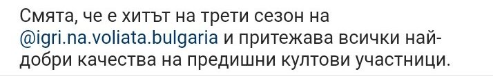 Аз си набелязах една скрита лимонка. Засега незабележимо тича с челната група, без да се откроява чак толкова. Но ако не си тръгне след някоя безславна номинация, имам усещането, че ще дръпне с един спринт на финала.
