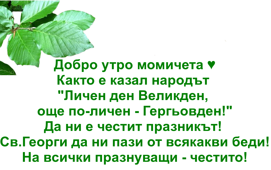 Здравейте момичета.От вчера такава вихрушка ме ветрее,че нямам време да пиша.Вчера сина ми имаше Имен (Мирослав),днес мъжа ми Георги.Дакато на приготвя,агънцето вчера да се оправи,тази сутрин в 4:00 съм станала,месото да се опече,дроб сарма,обикновен бял ориз,(някои гости не ядат дроб сърма).Много новини сте сложили, за което Благодаря. Екипа се сбогувал,снимки много сте сложили,коментари пак,златни сте.Много творчески път желая на всички от екипа на ДП,нека са живи и здрави,че не  ни изоставиха по средата на пътя,малкото ангелче Берен-пътя е пред нея,учи се от най големите.Хубав ден ви желая,честито на Именниците,с гордост да си носят името.Аз бягам,че гостите ще дойдат,но ще ви чета.Още веднъж Благодаря ви за всичко.