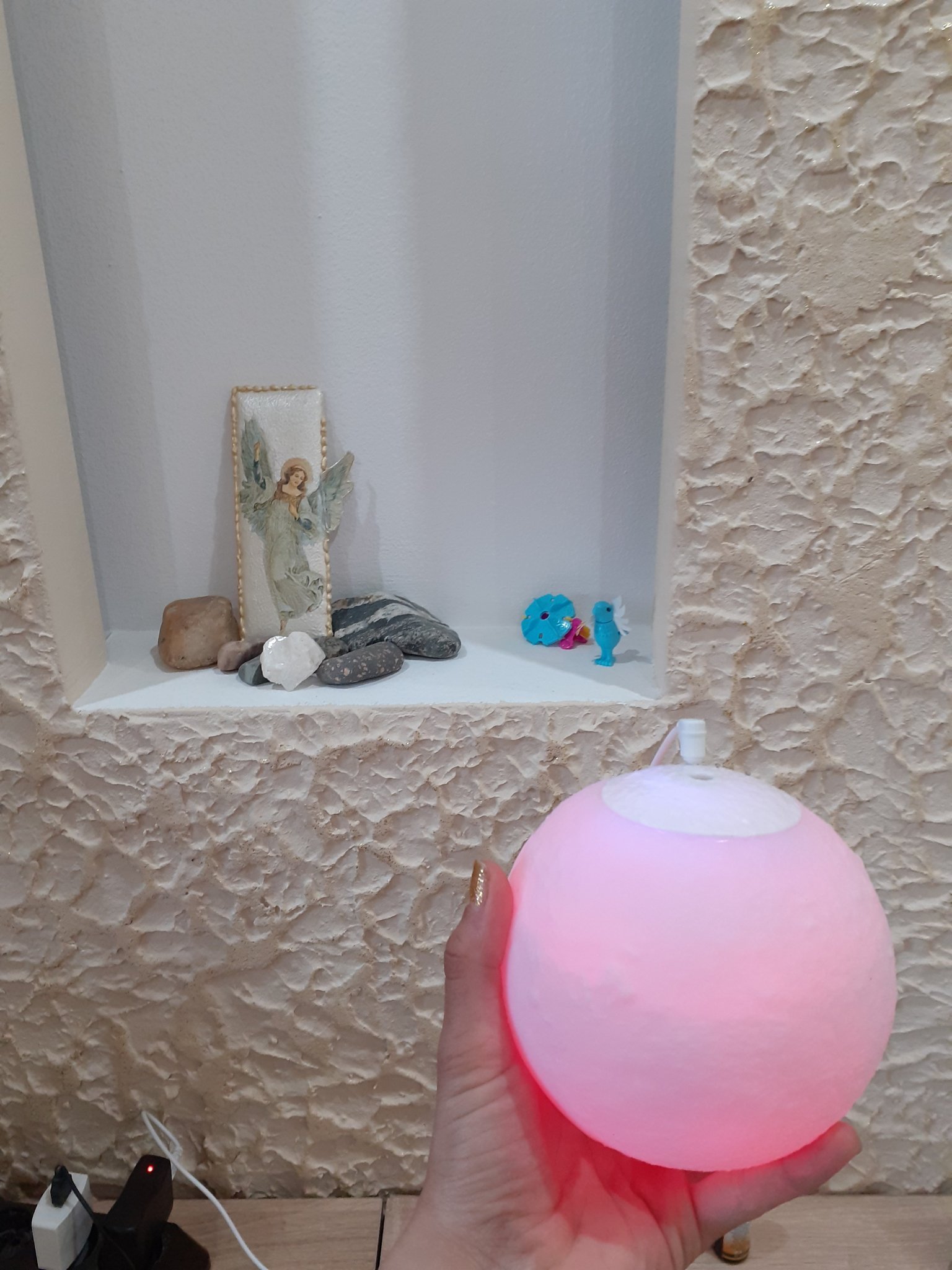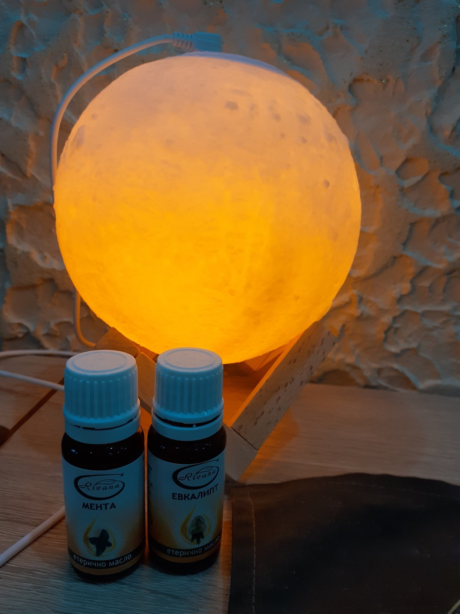 ние не сме маниаци на Арома терапията но си взех този дифузер лампа . С етерични масла сипва се вода и етер. Масло и имам лампа от истинска сол . Като солните стай който направиха. Еми приятно е един път прекалих с дифузера и с цял ден ми се спеше