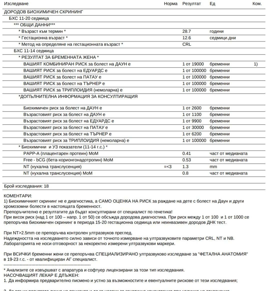 Моята док ми беше казала ама аз не знаех закакво е тоя показател че ако е под 0.59 вече съм много на границата и нее е ок,а всички рискове са ми 1;100 000 .. което е мн странно предвид,че кръвотока не беше мн ок така че не вярвам много вече и на бхс ,но моят риск за Папп излезна 1,29