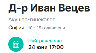 За да не чакате по 2-3 месеца за час при д-р Вецев, ако решите да се записвате, на супер док вървят за след месец, но много често се канцелират разни и излизат скорошни часове, понякога за утре. В момента го има този за след 10 дни: