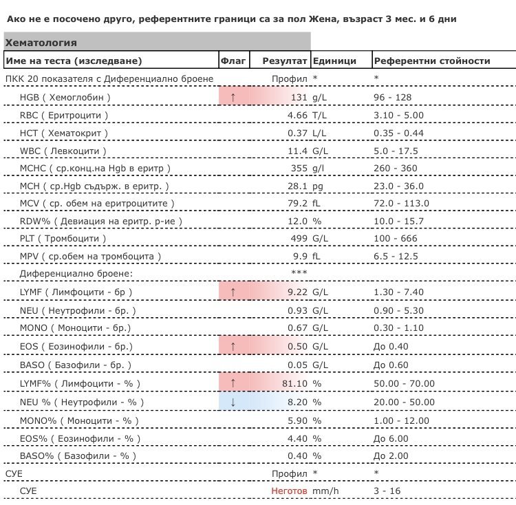 От моята педиатърка знам, че лефкоцитите при бебета са завишени. Също хемоглобина играе в зависимост от това дали детето е приемало повече течности преди изследването или не.