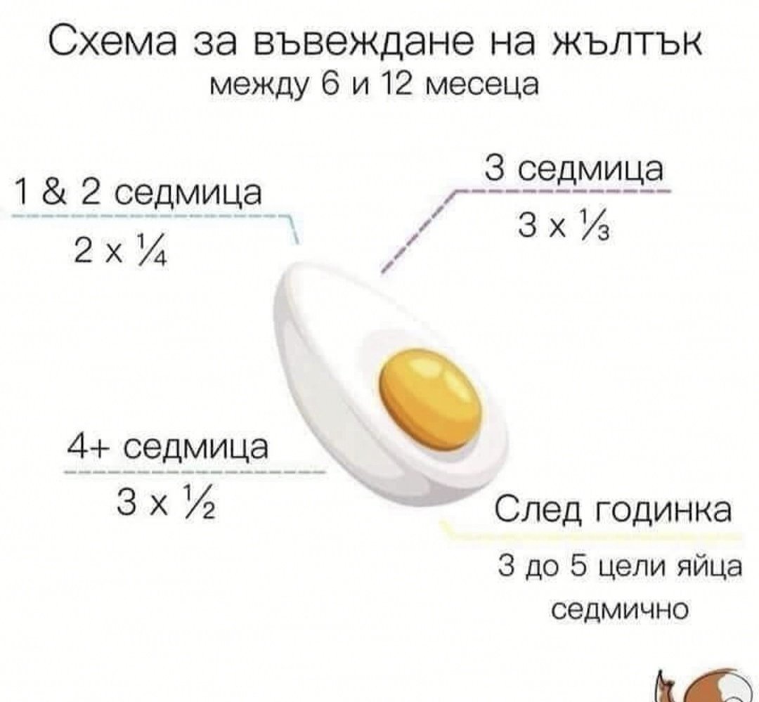 Аз ще всея смут с жълтъка. Хаха. Няма причина за отлагане на алергените. Ако в семейството няма фамилна обремененост към храни, може смело да се въвеждат алергени още от 6м. Новите изследвания са, че колкото по-рано ги вкараш, толкова по-малко вероятност има да развият алергия. 20-30% по-малък шанс в сравнения с късното им включване в менюто.