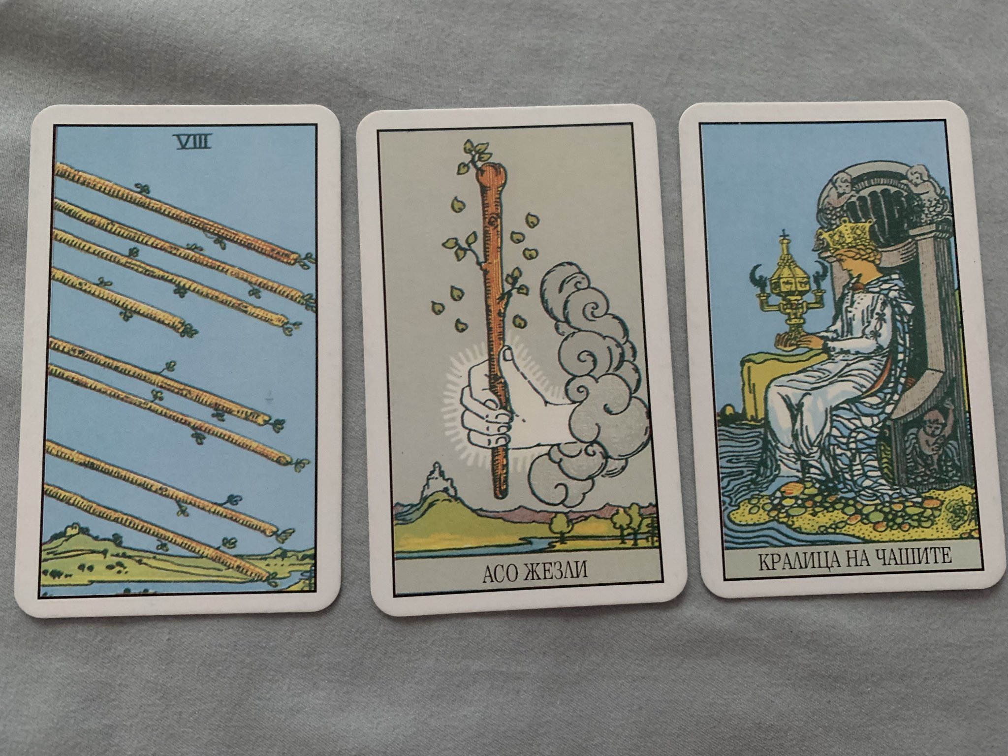 3.Върху десятка чаши и Кралят на пентаклите, които бяха една след друга сложи карта Кралица на купите.