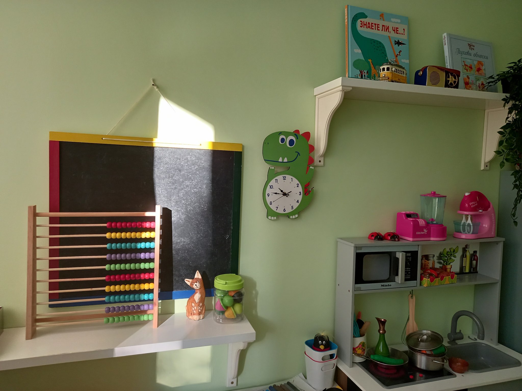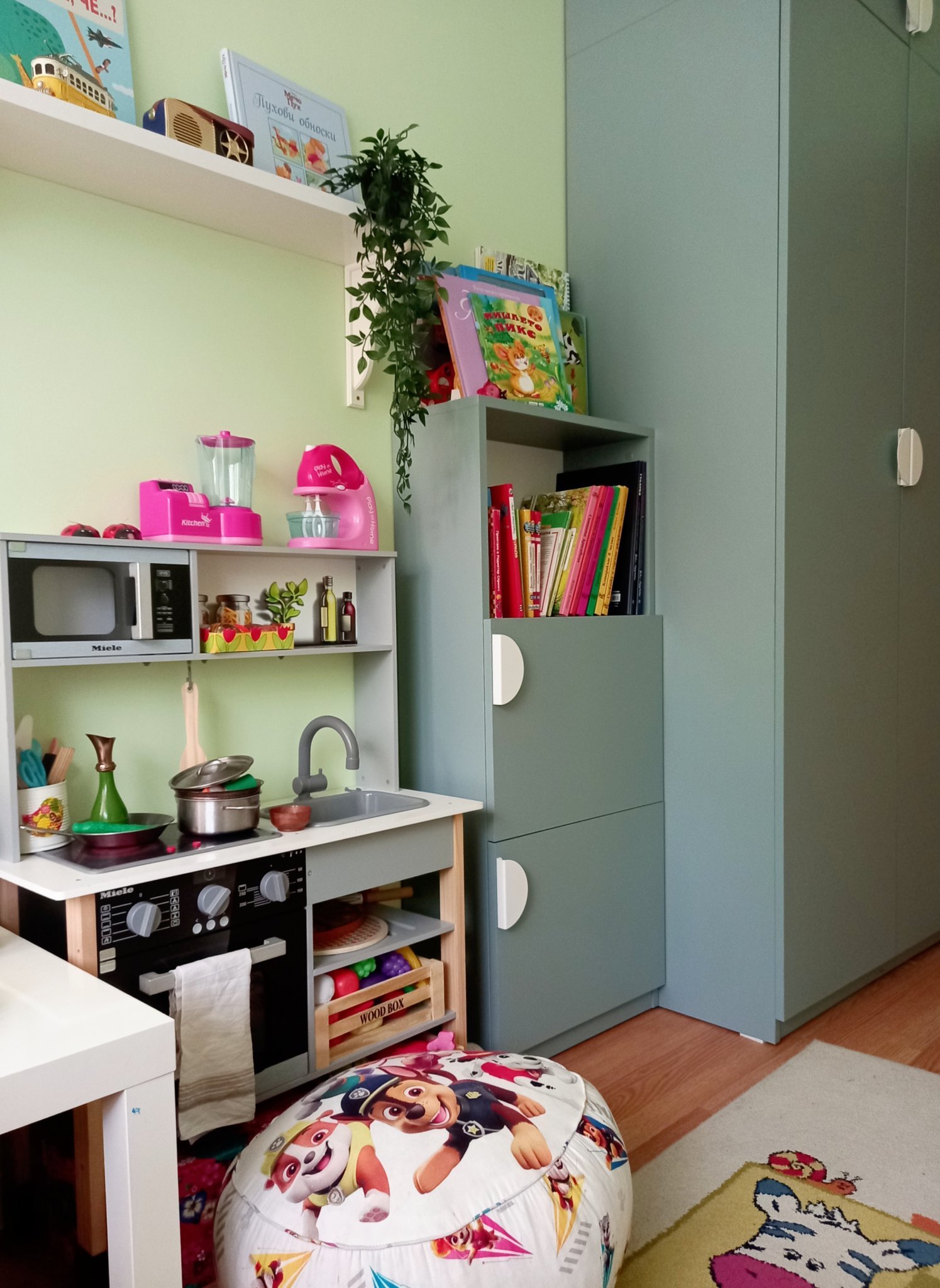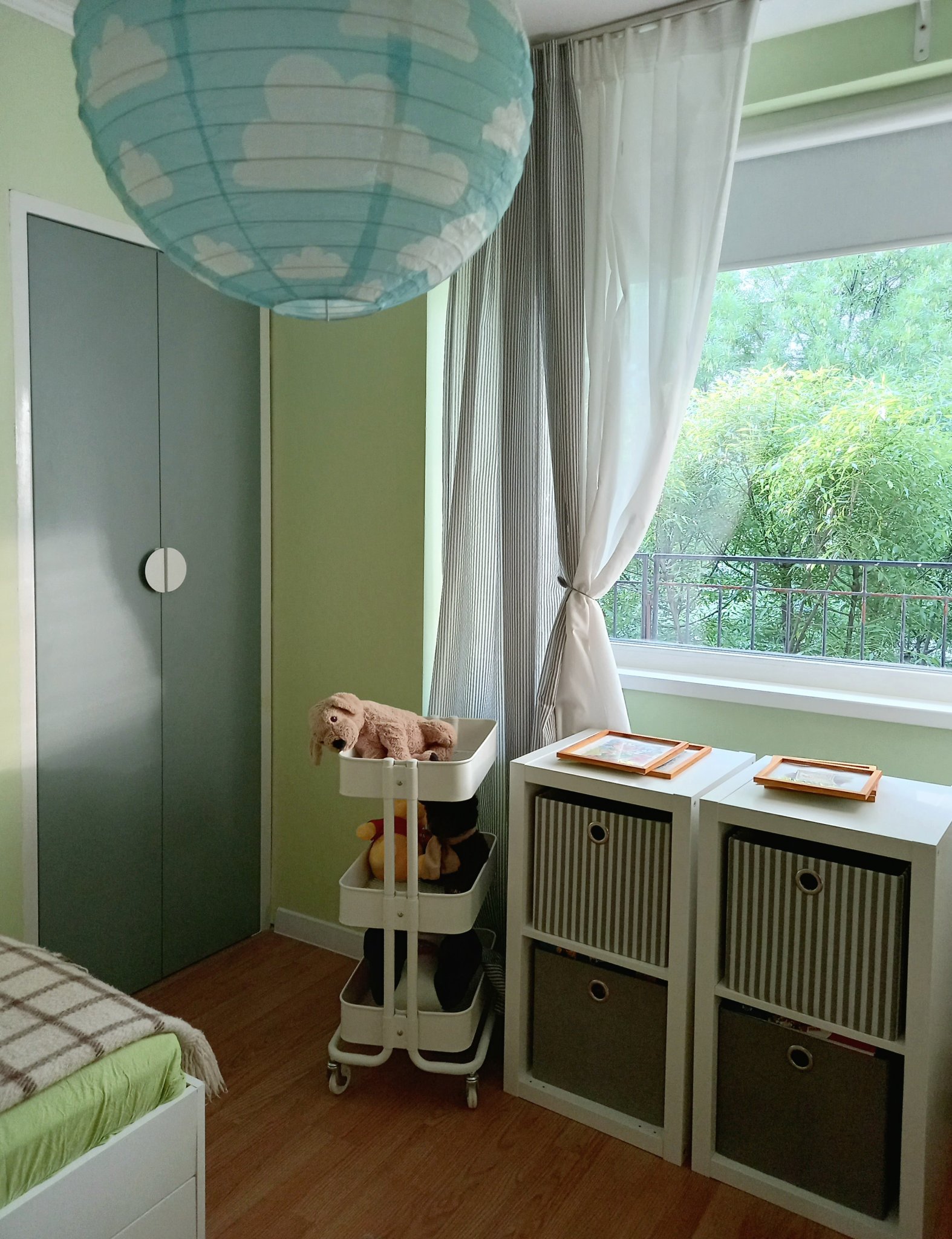 За зелените стени - истината е, че не е точно този цвят, който си представях първоначално, но нямахме сили да се захванем с пребоядисване. Както се вижда, не сме закачили никакви картини още, само са налични в стаята. Предполагам, че като ги поставим, те ще изпъкнат на преден план пред цвета на боята.
