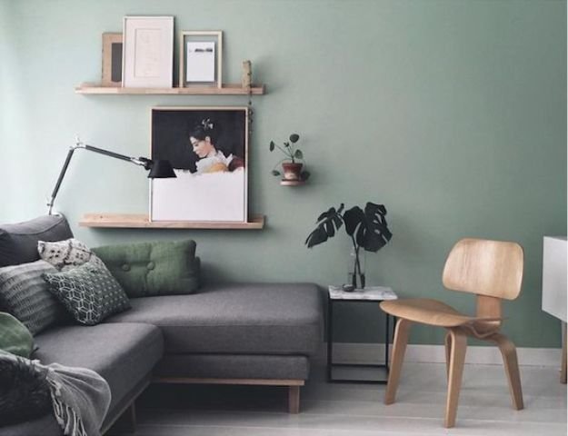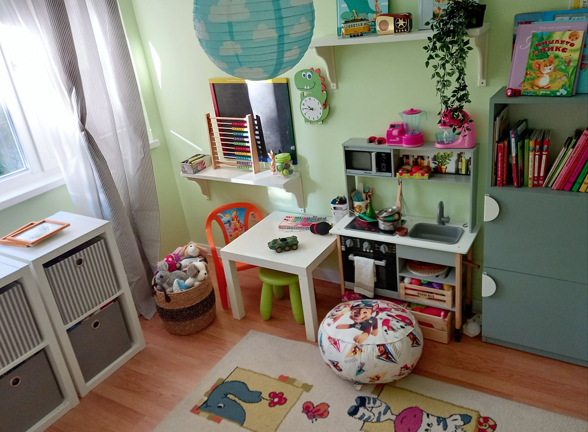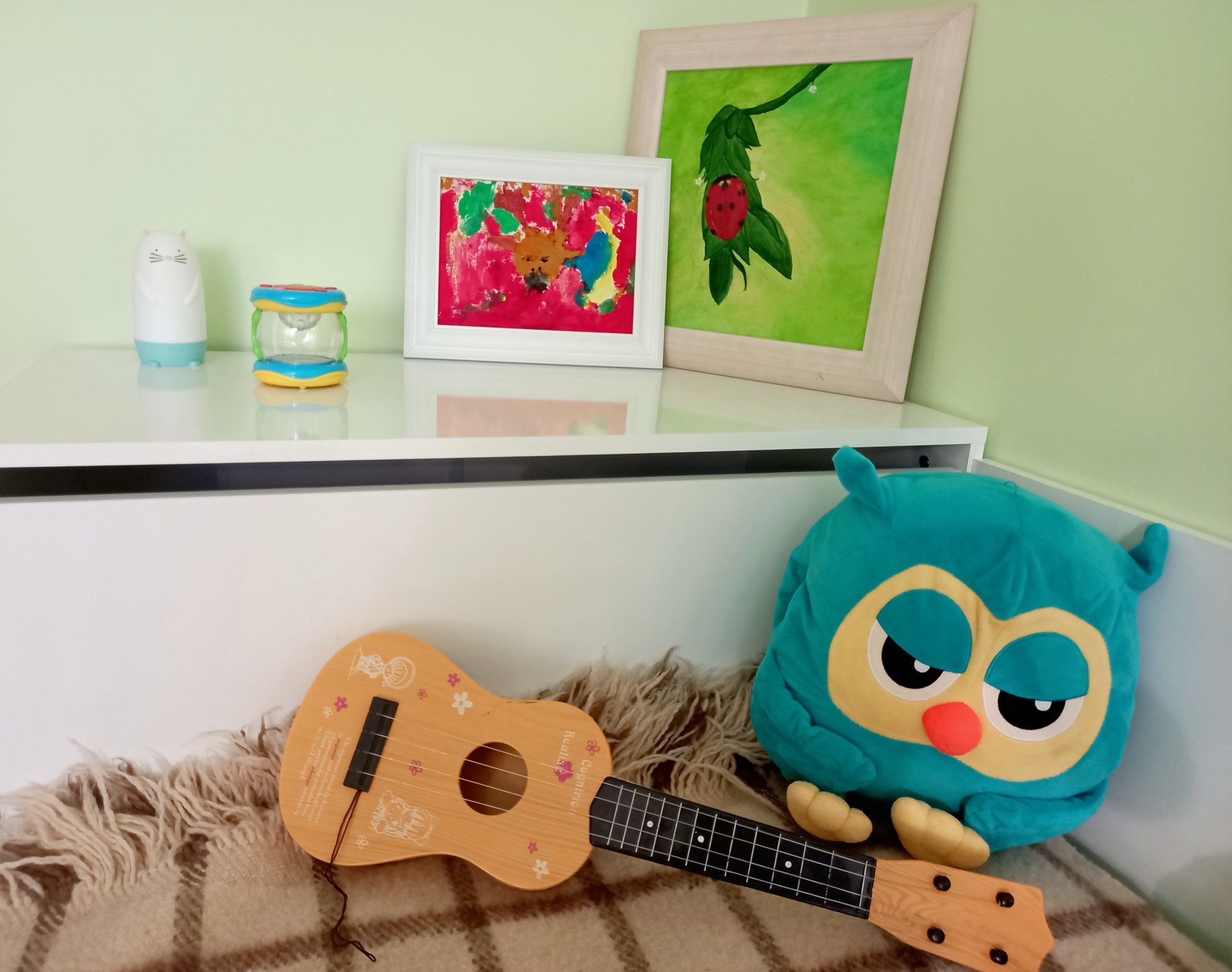 За зелените стени - истината е, че не е точно този цвят, който си представях първоначално, но нямахме сили да се захванем с пребоядисване. Както се вижда, не сме закачили никакви картини още, само са налични в стаята. Предполагам, че като ги поставим, те ще изпъкнат на преден план пред цвета на боята.