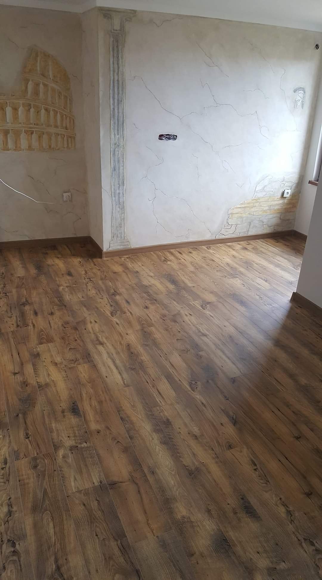 На ламинат прилича. И за мен е малко шарено. Бях харесала подобен в Бг,още не сме го купили. На стената като мостра (в магазина) -изглежда супер,но сега като гледам този и  започнах да  се разколебавам,защото ние няма да сме с бели мебели и ще е трудно съчетаването.