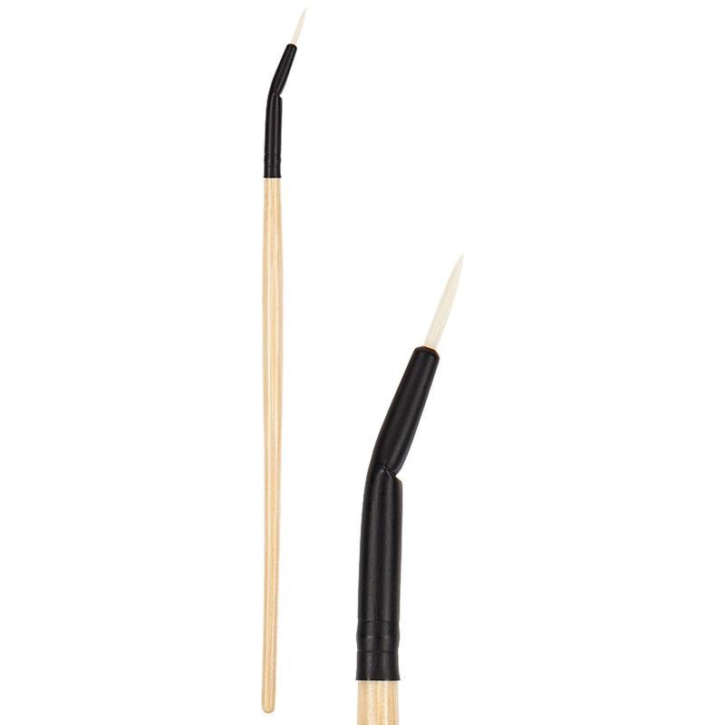 Когато взимам очна линия от бурканчето - леко докосвам едната страна на гърлото на бурканчето, после на 180 градуса другата страна - все едно я подострям и сплесквам - и така с острото връхче - започвам да правя линията. Четката изглежда, като нож.
