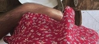 Това е ръката на мъжа й. Държи я през краката, тя е стъпила на стола. Частично е скрита ръката от роклята й.