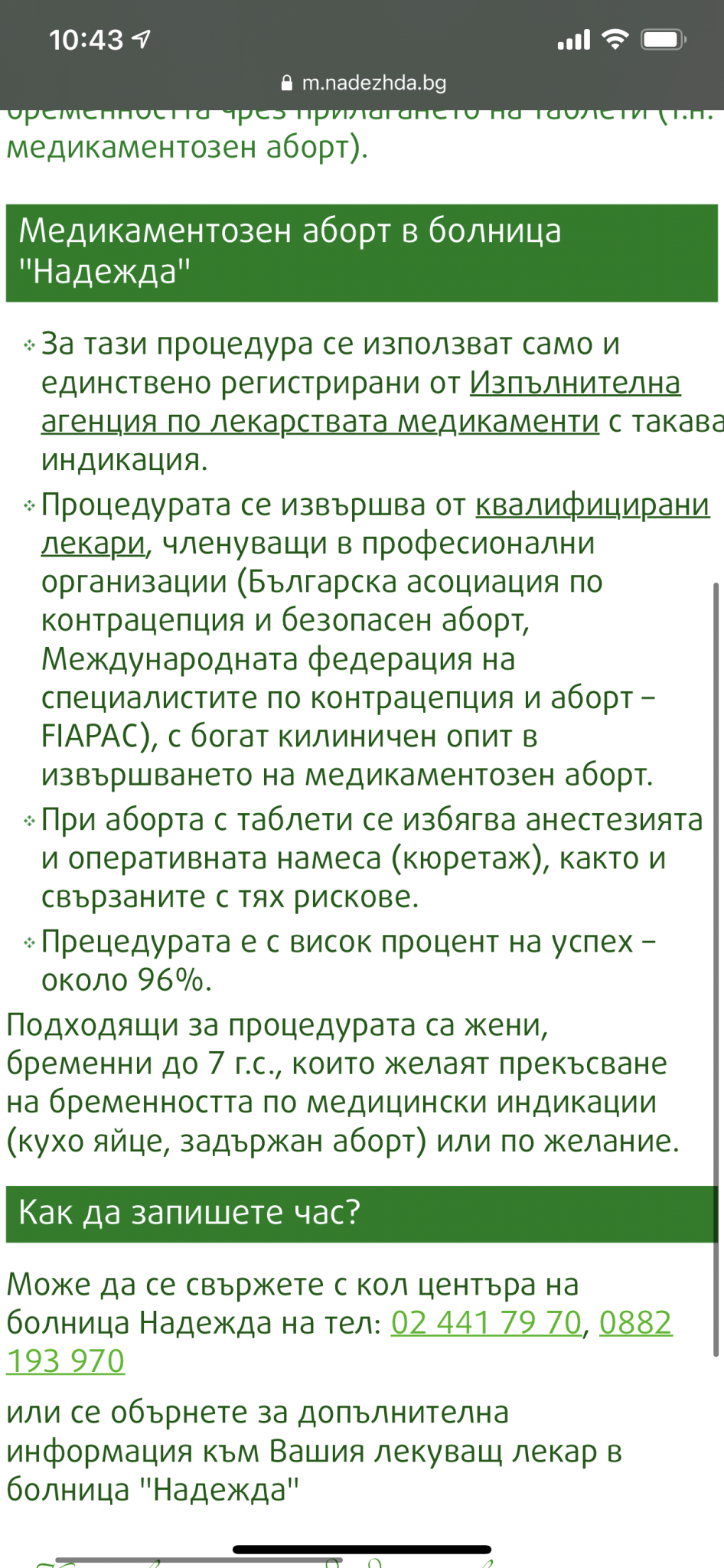 Преминала съм през този аборт. до 12 та се прави друг тип аборт по желание . Корегирам си поста защото се подвеждам от вас ! Аборт по желание се прави до 12 та седмица , медикаментозен аборт се прави до 7-8 седмица и в краен както казах случай до 9-10 ако ембриона отговаря на 8 ма седмица. До 12 седмица е рисково да се прави такъв тип аборт зарадм усложненията . Заради това казах че се прави до 8-10 за да няма усложнения. Пускам и снимка от Надежда до коя седмица го дават .