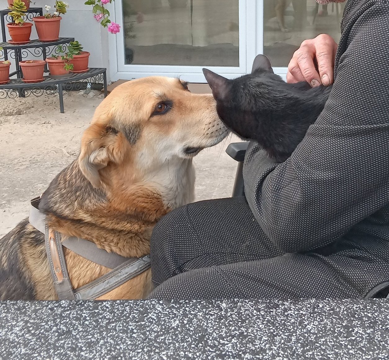 Чак едно куче с направо човешки поглед седна да го успокоява(и успя...нещо му скимтеше)...