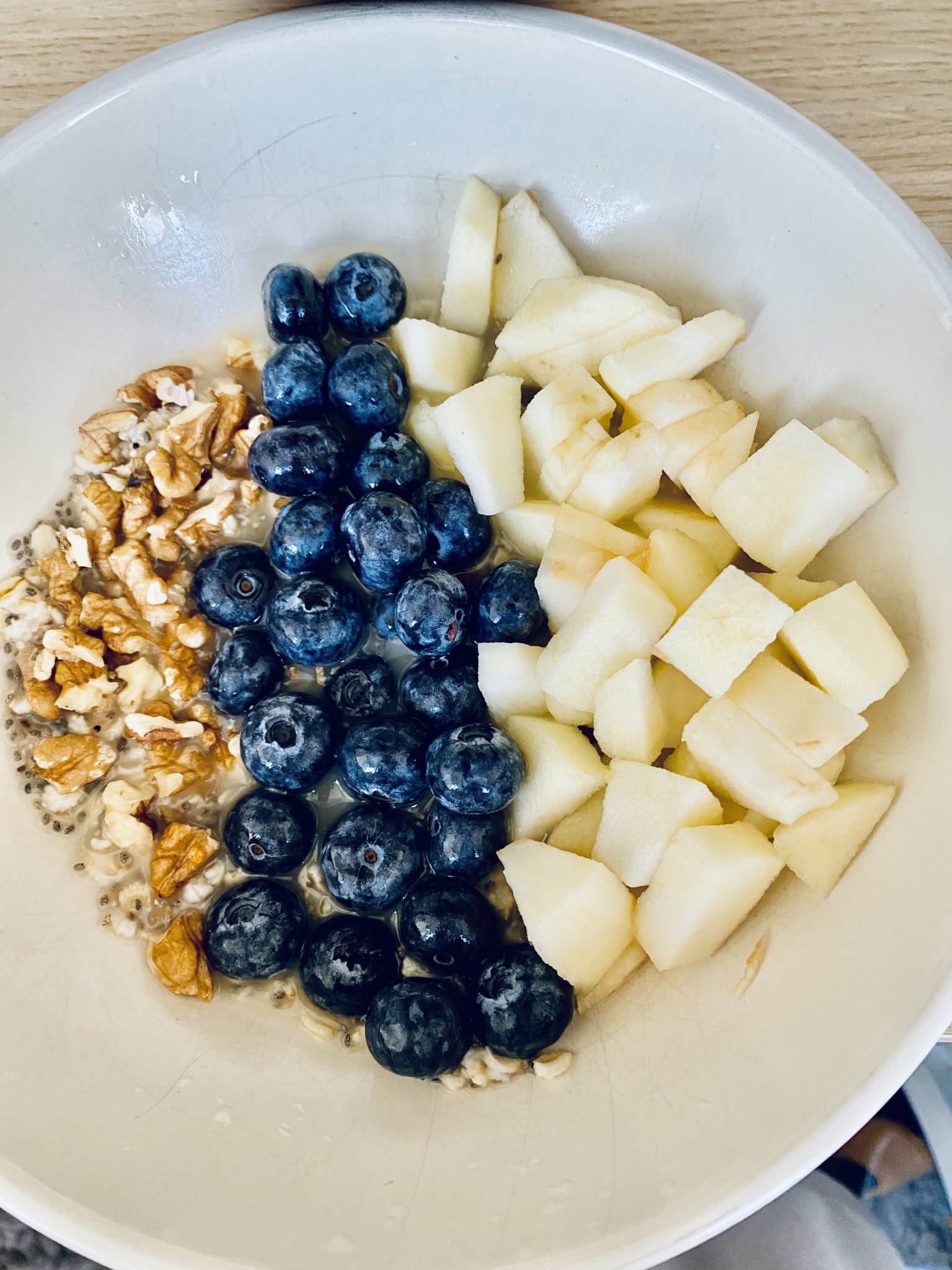 Закуска- овесени ядки с чия, орехи, стафиди, мед, ябълка и боровинки.