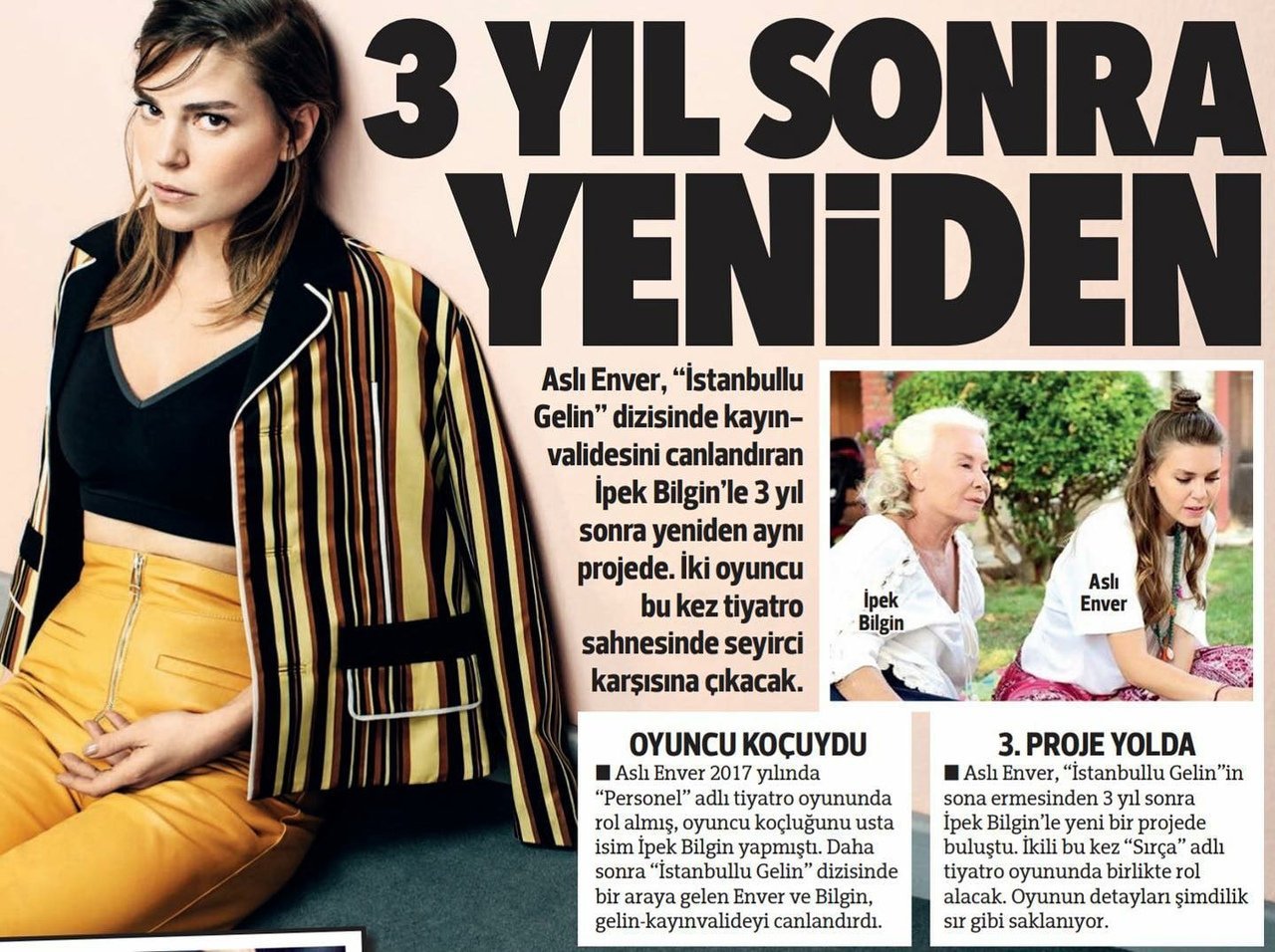 Днес пресата съобщава, че Аслъ Енвер се завръща на театралната сцена. Неин партньор ще бъде Ипек Билгин. Пресата припомня, че Аслъ и Ипек вече са работили заедно. Ипек беше неин ментор в театралната постановка "Персонал", за която Аслъ получи наградата "Най-добра театрална актриса" през 2015 г. И Аслъ, и Ипек играха заедно в "Истанбулска булка/невеста",като снаха и свекърва. И сега те се срещат за 3-ти път в продукцията на Sırça / Glass, чийто сюжет се пази в тайна.