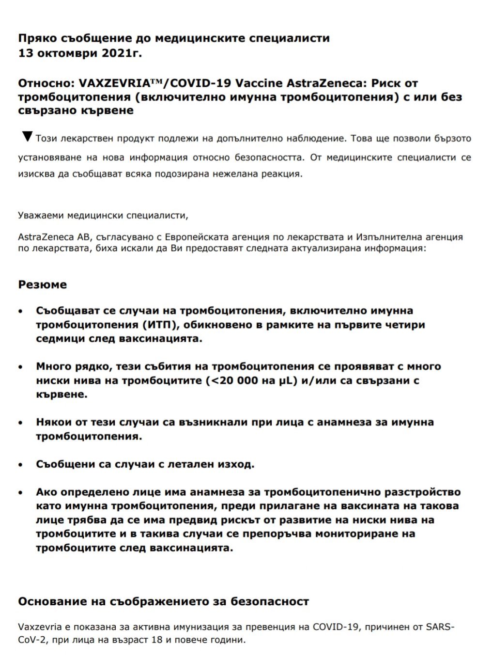 Лицата с клинична картина на тромбоза в рамките на 3 седмици след ваксинацията трябва да се оценяват за тромбоцитопения за евентуално диагностициране на синдром на тромбоза с тромбоцитопения (TTS), който налага специализирано клинично лечение.