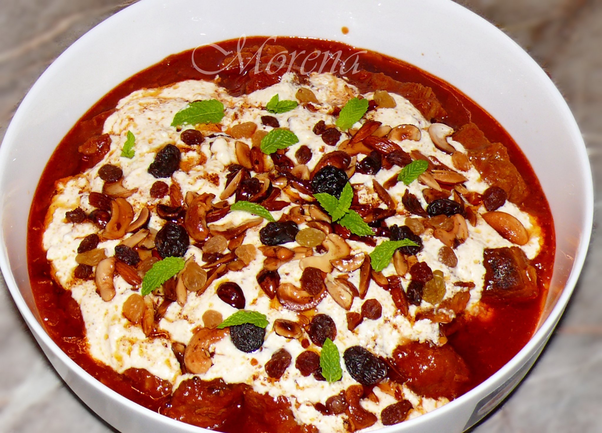 Една Мутанджана (веднага стана любима) от снощи, с телешко със сос и биволско мляко с шафран и карамлизиран лук, пържени ядки и стафиди.
