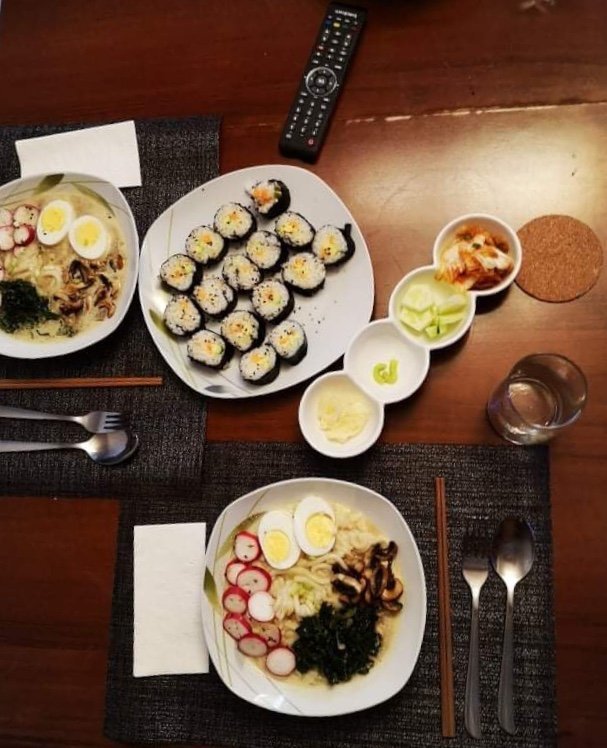 Направих вегетерианско суши с авокадо, краставица и моркови, като към плънката добавих мус от майонеза и соев сос, тъй като трябваше да избегна млечните и да заменя любимата филаделфия. Основното беше импровизирани удон нудълс с гъби, задушен спанак, репички и яйца. В рецептата, която ползвах се добавяше лъжичка тахан в бульона за по-кремообразен вид, но сложих и малко растителна сметана, за да докарам съвсем една визия от пинтерест.