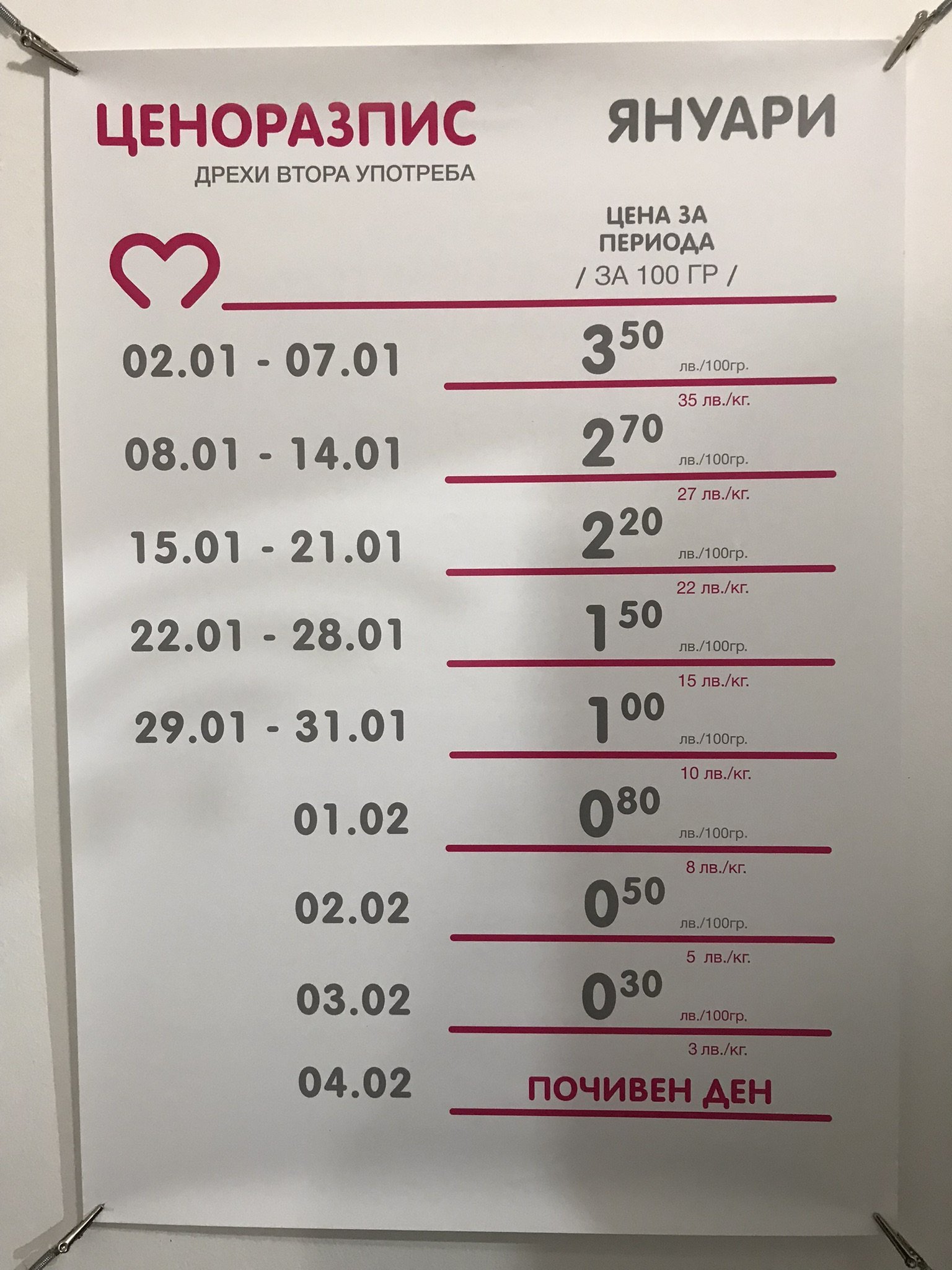 Сивото поло имаше етикет 5 лв. Лилавото - 4 лв. Сивата блуза - 4 лв. Сакото - 5 лв. Беше понеделник и се оказа, че всичко е на цена от 3,50 лв.