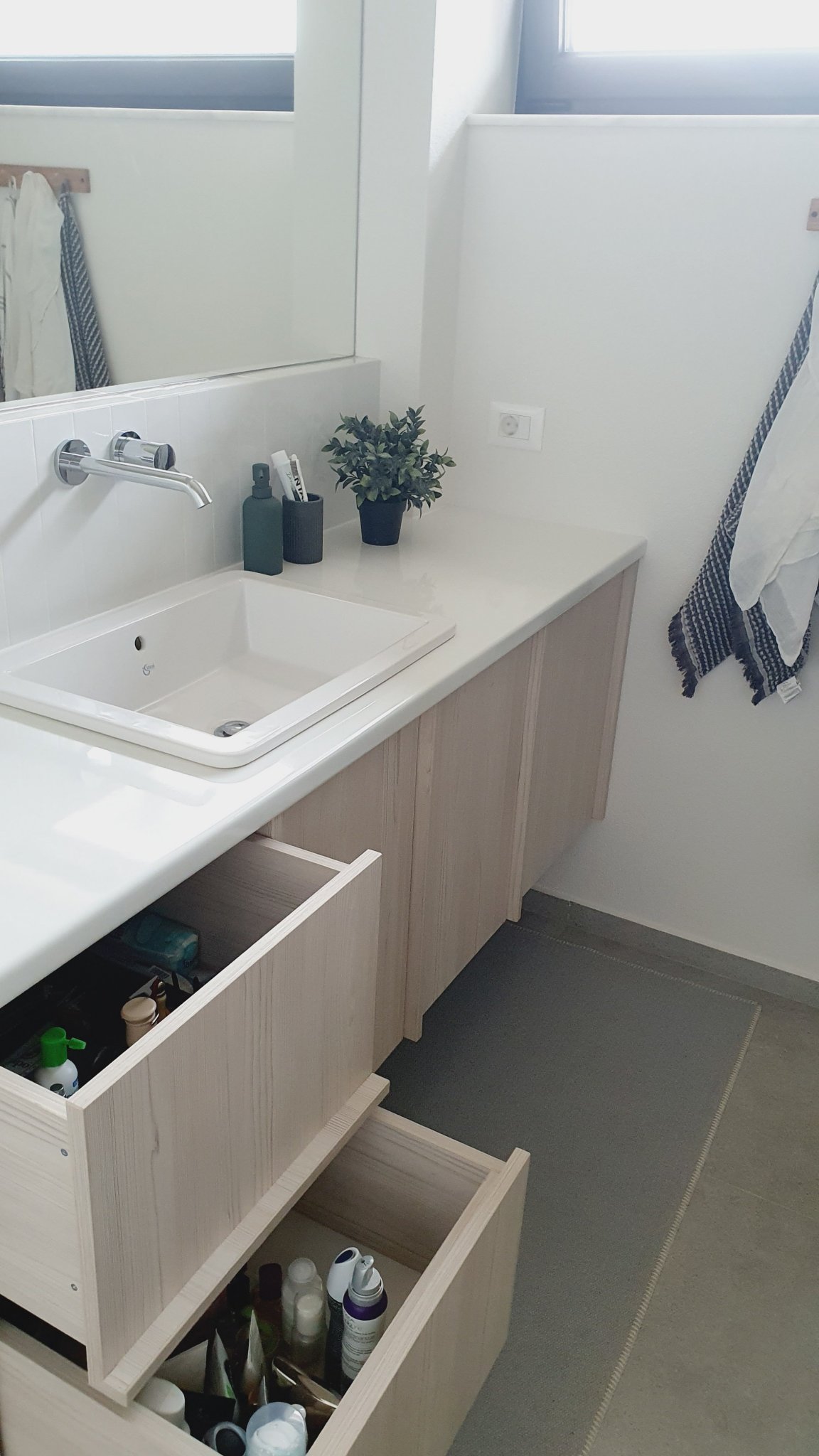 Навсякъде сме с големи плотове,но и с големи шкафове и чекмеджета под тях.Върху плота само сапун и четки да зъби.Понякога и цветя:) .