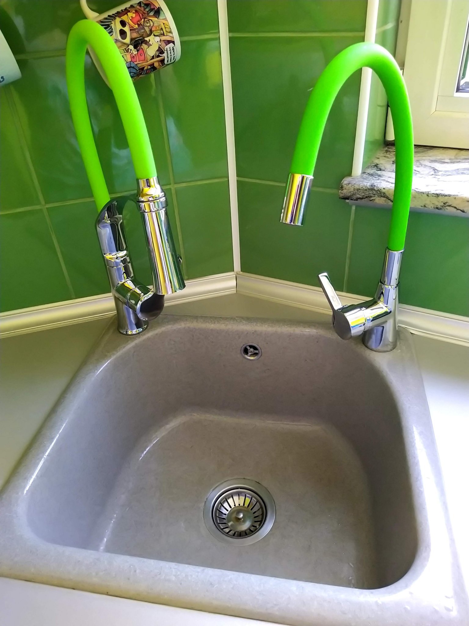С два смесителя сме там, понеже единият е за питейната вода, която минава през филтърна система. С нея проблем няма, но големият и основен смесител пръска и винаги остават капчици, които като изсъхнат, остават бели петна (виждат се на малкия смесител, а големият е вече напръскан с АСЕ спрей против варовик). Пулвелизаторът и тук се оказа много добнро решение на производителя – достигат се лесно и труднодостъпните места!