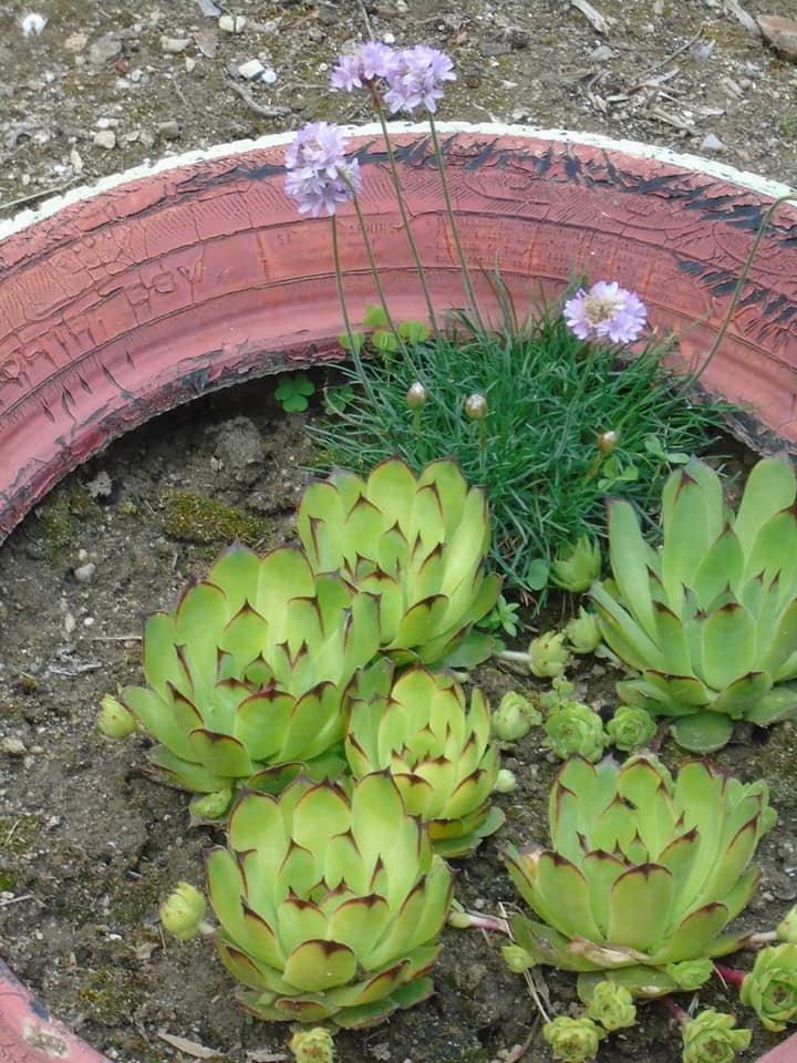 И моята армерия на работата ми тръгна много добре. Това е на един алпинеум. Обаче ми изникна стар проблем, заради който може да се наложи да  местя цветята и много ще ме е яд, ако ги унищожа.Миналата година отдолу се бяха заселили стършели и покриха алпинеума с найлони, заради което те повече не се вяснаха досега . Ей, пак се пръкнаха, а аз така се радвам, че всичко дето боднах (има и лавандула, гумите са 5 с различни цветове армерия ), тръгна. Опасни са и ще чакаме фирма, която се занимава с дератизация, да се опита да реши проблема. Бях ви казала, че и на вилата засадих есента армерия и засега няма цвят, расте само на туфа .