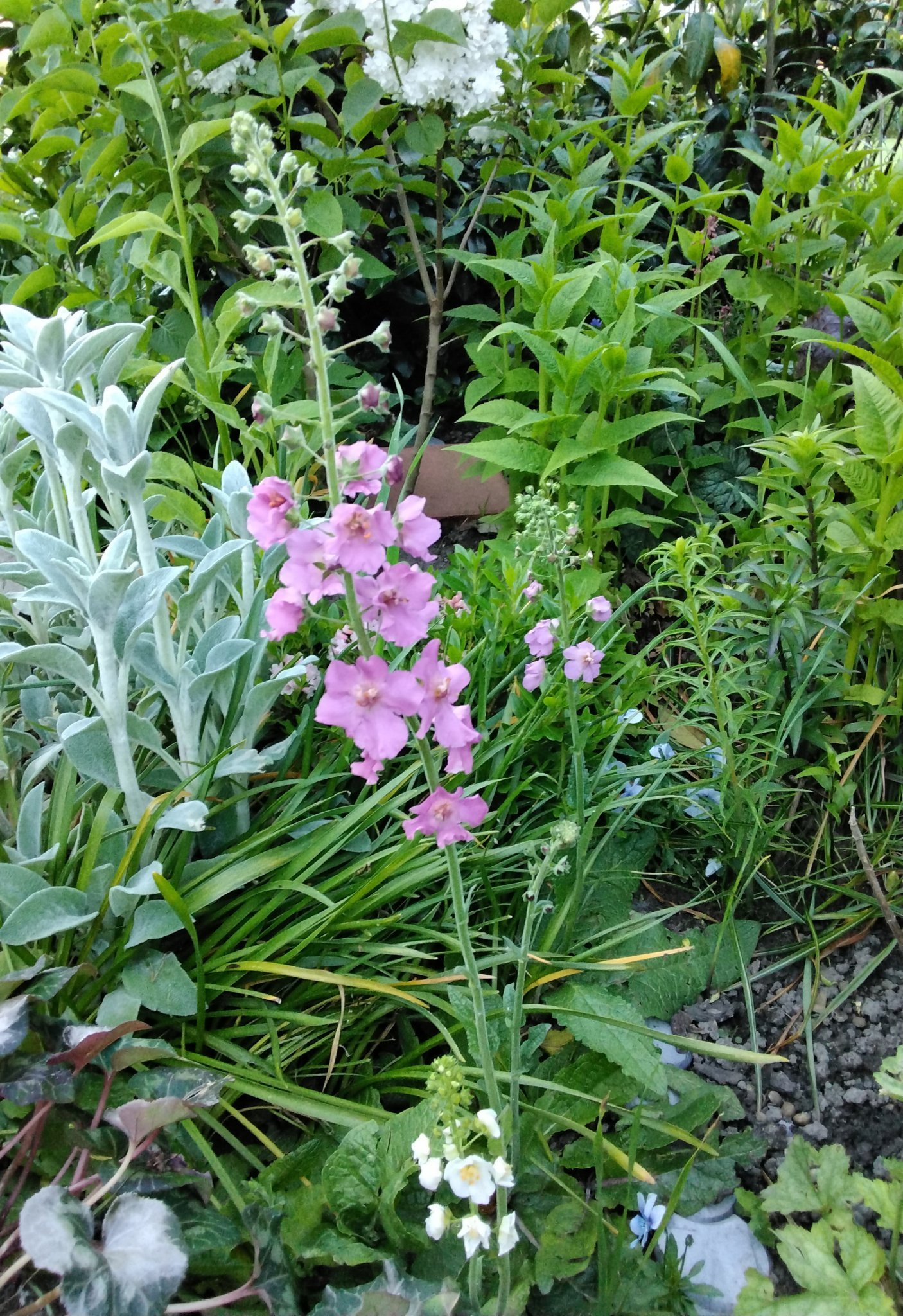 Добри, връщах се да търся девесила Blush Бялото е вербаскум, роднина на лопена. Много искам да го похваля това растение, цветоносът се удължава до безкрай и цъфти месеци наред. Миналата година цъфтя само едно растение, лилаво, тази година са повече и в най-различни цветове. Двугодишно е обаче, първата година прави само листна розетка и на втората цъфти. Аз правих разсад, но мисля че на подходящо място ще се засява и самичко, от всяко цветче се образува семенна кутийка.