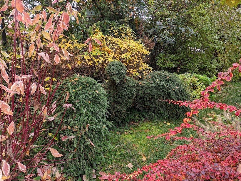 Разкош е с червените краски, и някакъв паун май се заформя, може ли да споделиш какъв е храстът дето е подстриган така?