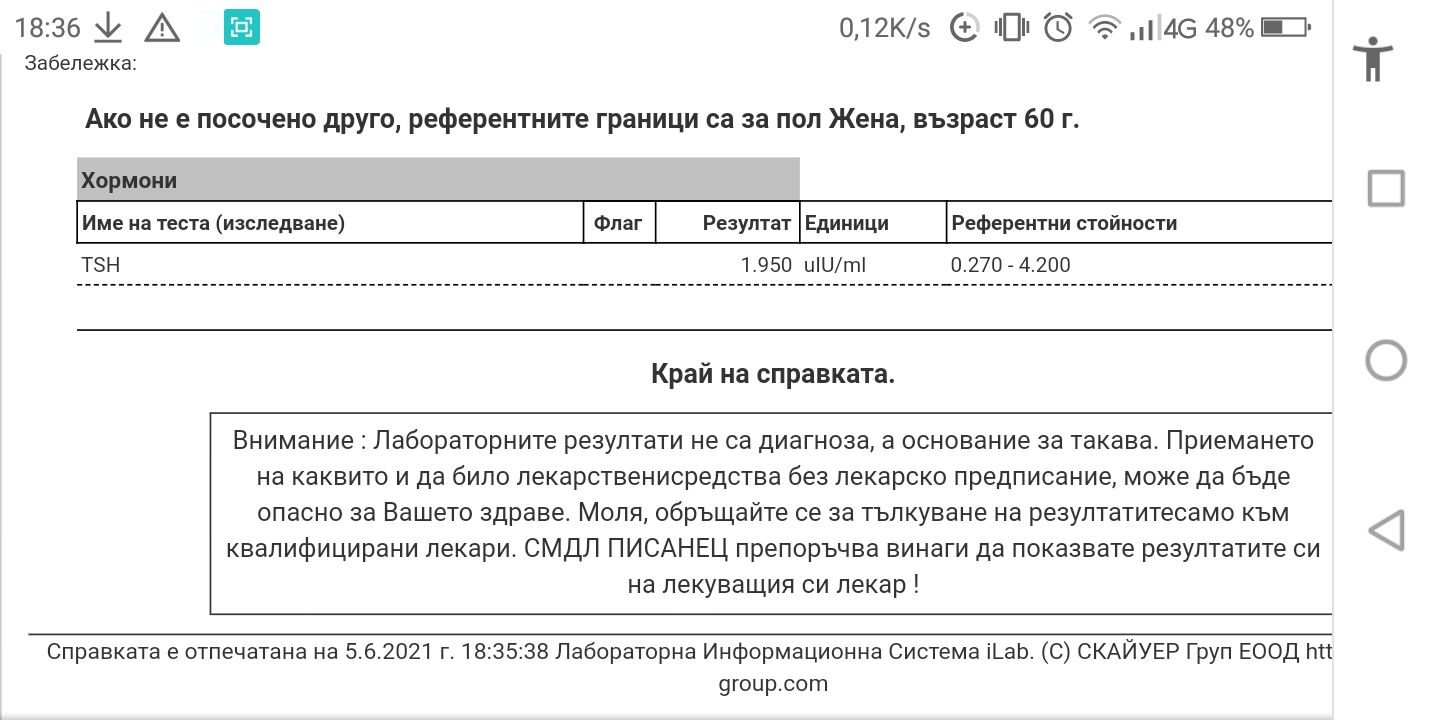 Първите показани изследвания са в 'Бодимед' (вторите с по-ниския TSH в 'Рамус'). Има наднормено тегло, което не успява да намали, въпреки че се опитва с балансирани диети (аз съм с ИР и съм на нисковъглехидратно хранене, все ѝ говоря в тази посока) и умерен спорт, окосмяването не е мъжки тип, няма лицево, но ми се струва засилено като сравнявам със себе си, потене, акне и омазняване на косата и кожата също, доста е уморена и сънлива. Вече има запазен час за ендокринолог, така се получи, че е седмица преди този за гинеколога, малко наобратно. Ще пуснем и ОГТТ с трикратен инсулин, и антителата в понеделник (мислех в Цибалаб, но май пак в Бодимед), после на трети ден и необходимите полови, ще повторим и тестостерон, 4-андростендион да се види, мислех, че за тях няма значение денят особено. Благодаря за мненията!