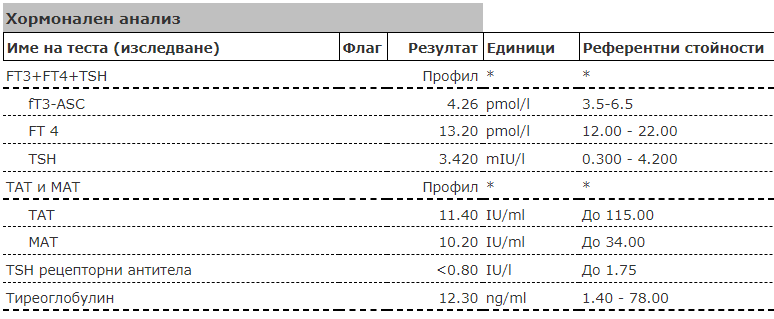 Преди да отида при ендокринолога си пуснах и допълнителните хормони Ft3, Ft4, TAT, MAT, TG, THS + TSH реценторни антитела. Лекарят каза, че няма нарушение в работата на щитовидната жлеза. За жалост ми каза, че имам гестационен диабет и ми каза, че за момента няма да ме слага на инсолин, само на нисковъглехидратна диета. След месец и половина трябва да си направя отново изследванията и да отида пак на преглед при ендокринолога.