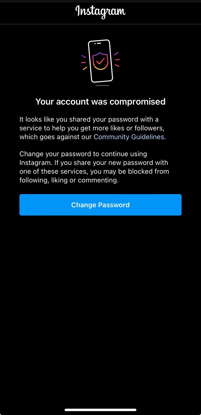 Пише, че трябва да си смениш паролата, защото си я споделила на някакво странично приложение. И пише, че ако продължаваш да ползваш такива, ще те баннат. Мен веднъж ме баннаха 😅