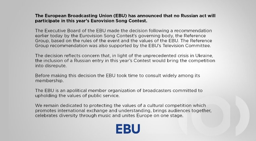 EBU обяви вчера, че Русия няма да участва в Евровизия 2022, а днес двата руски канала, които са членки на EBU - ВГТРК и Первый канал, напуснаха съюза.