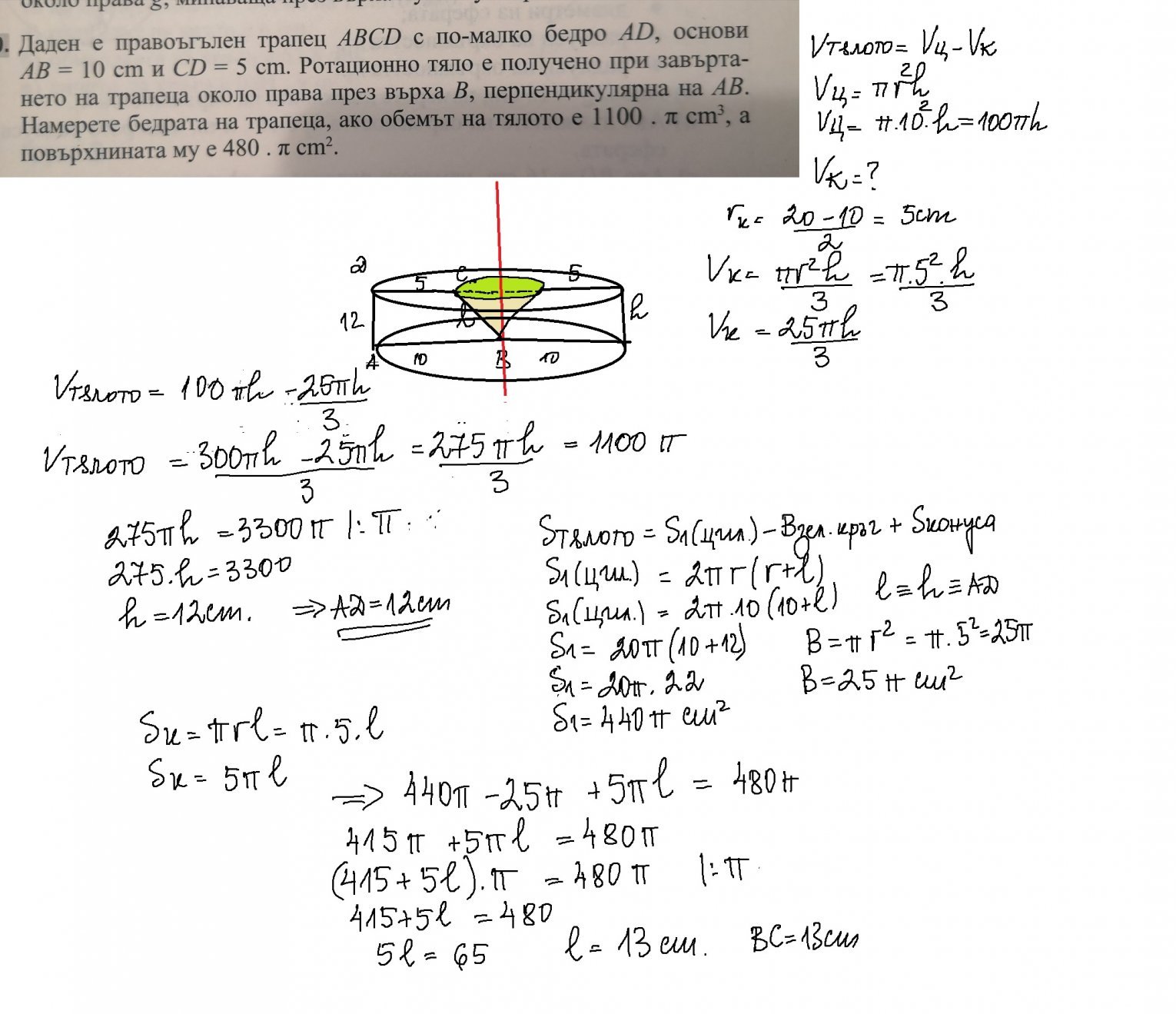 Обема е V=Vц-(Vk1+Vk2)=П.r2.h-(1/3.П.r2.h1+1/3.П.r2.h2)=П.r2.(h-1/3(h1+h2))