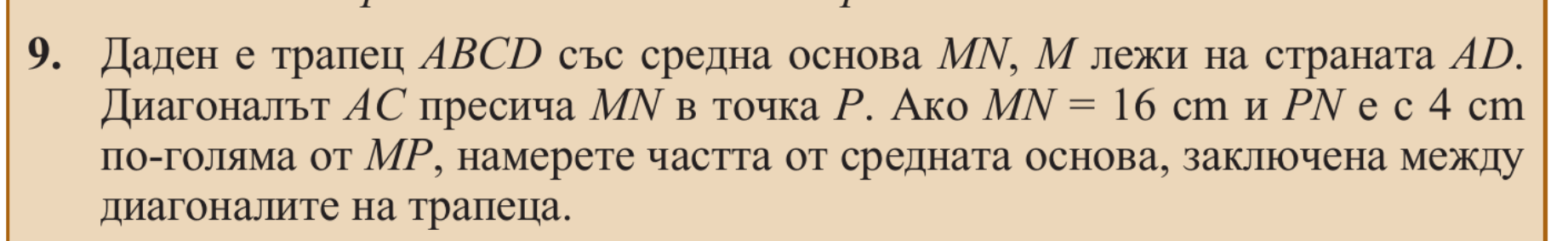 Използвах първо, че фигурата MBCD e успоедник, тъй като има две по две успоредни страни, затова DC=МВ=8, BC=DM