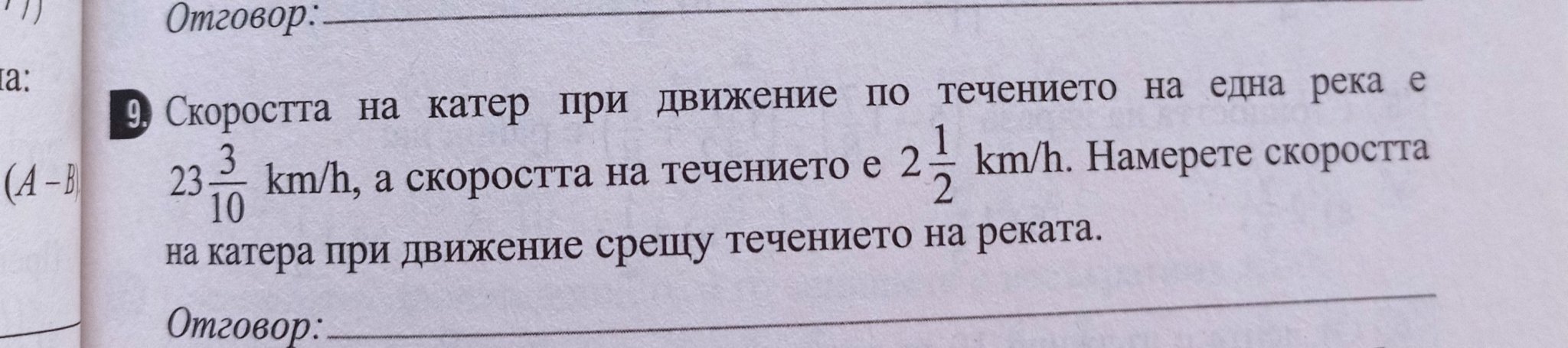 Скорост срещу течението  = Скорост на катера - Скорост на течението