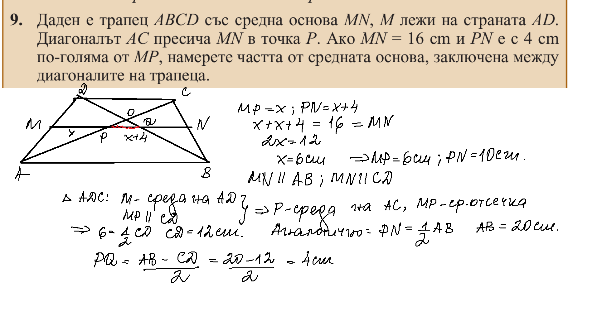 MP=KN (и двете са 1/2 от CD, тъй  като са средни отсечки в ACD и BDC - това трябва да се докаже в разписването. М среда на АD, MP e успоредна на CD => P е среда на AC => MP e средна отсечка в триъгълника ACD. За KN аналигично)